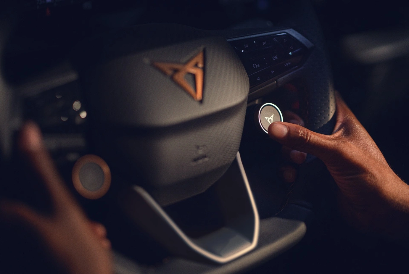 Wnętrze Cupry Born to kokpit przyszłości, zaprojektowany wokół kierowcę. Dominuje tu sportowa, podgrzewana kierownica wielofunkcyjna obszyta skórą, wyposażona w przycisk trybu Cupra oraz przycisk wyboru profilu jazdy. W jej towarzystwie znajduje się cyfrowa tablica przyrządów z kolorowym ekranem TFT 5,3 cala oraz olbrzymi, 12,9-calowy ekran infotainment, który jest sercem całego systemu zarządzania pojazdem.