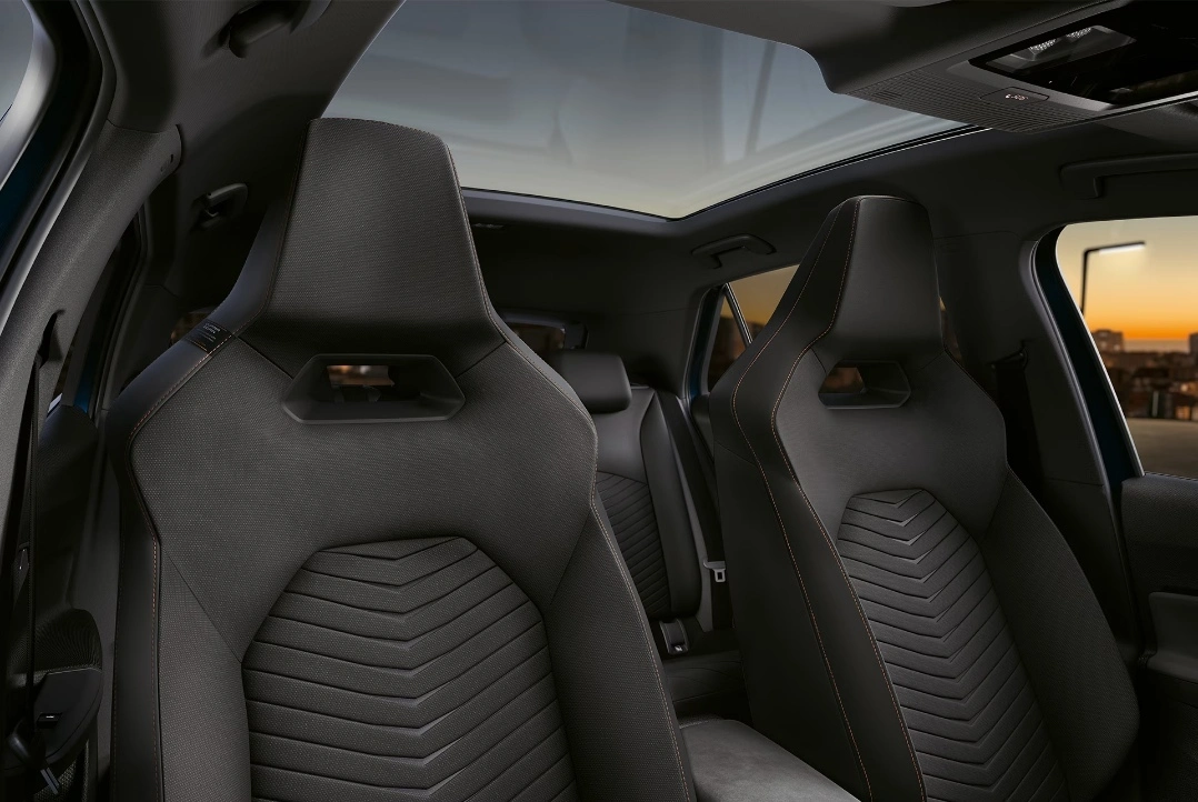 Podstawowa tapicerka również wyznacza standardy. Wyprodukowana z materiałów upcyklingowych, pozyskanych z mórz i oceanów. Fotele kubełkowe z czarnej tkaniny z przeszyciami w kolorze miedzi.