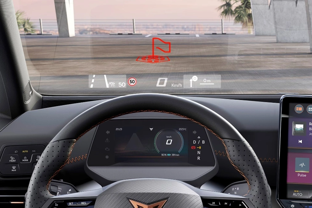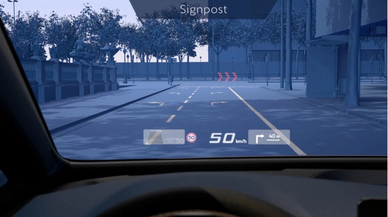 Wizualne wskazówki dotyczące drogi pojawiają się tam, gdzie powinny – na drodze. System oferuje wciągające wrażenia, które integrują istotne dane dotyczące jazdy i wyświetlają je bezpośrednio na przedniej szybie, prowadząc Cię prosto do celu podróży.