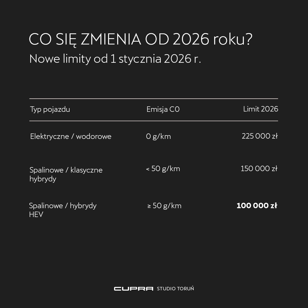 Od 2026 roku limit dla aut spalinowych spada do 100 000 zł. To nawet kilkadziesiąt tysięcy zł mniej w kosztach.